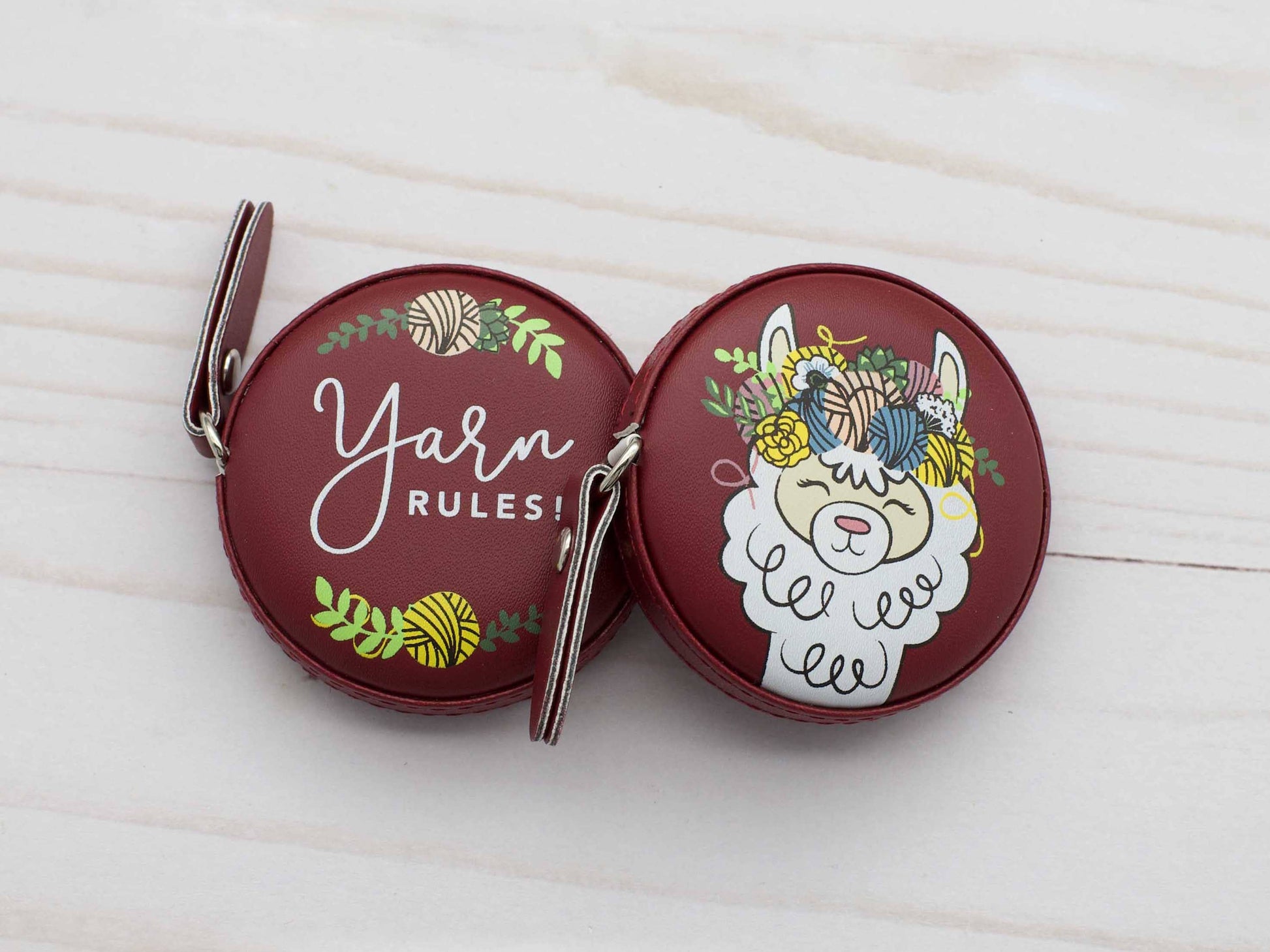 Premium high-quality soft faux-leather measuring tape. A must-have for your notions & craft tool bag. Retract the measuring tape by squeezing the front and back gently.