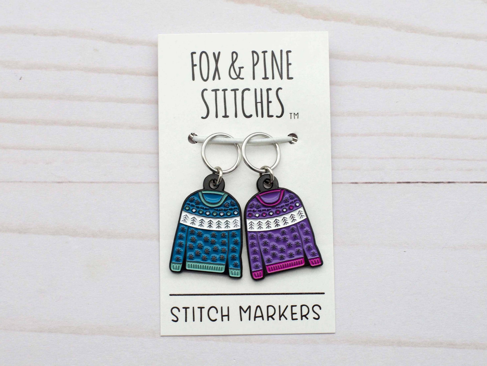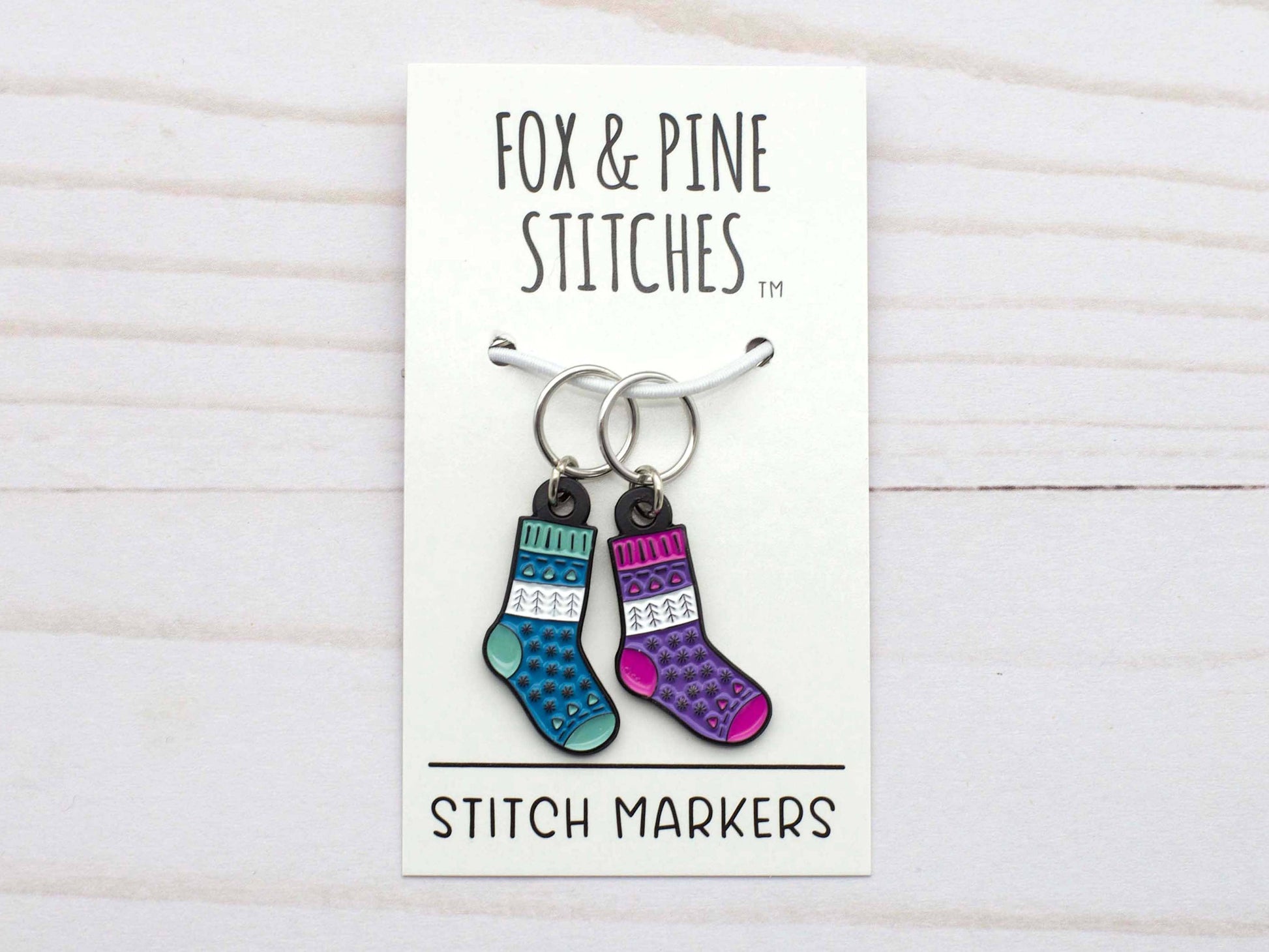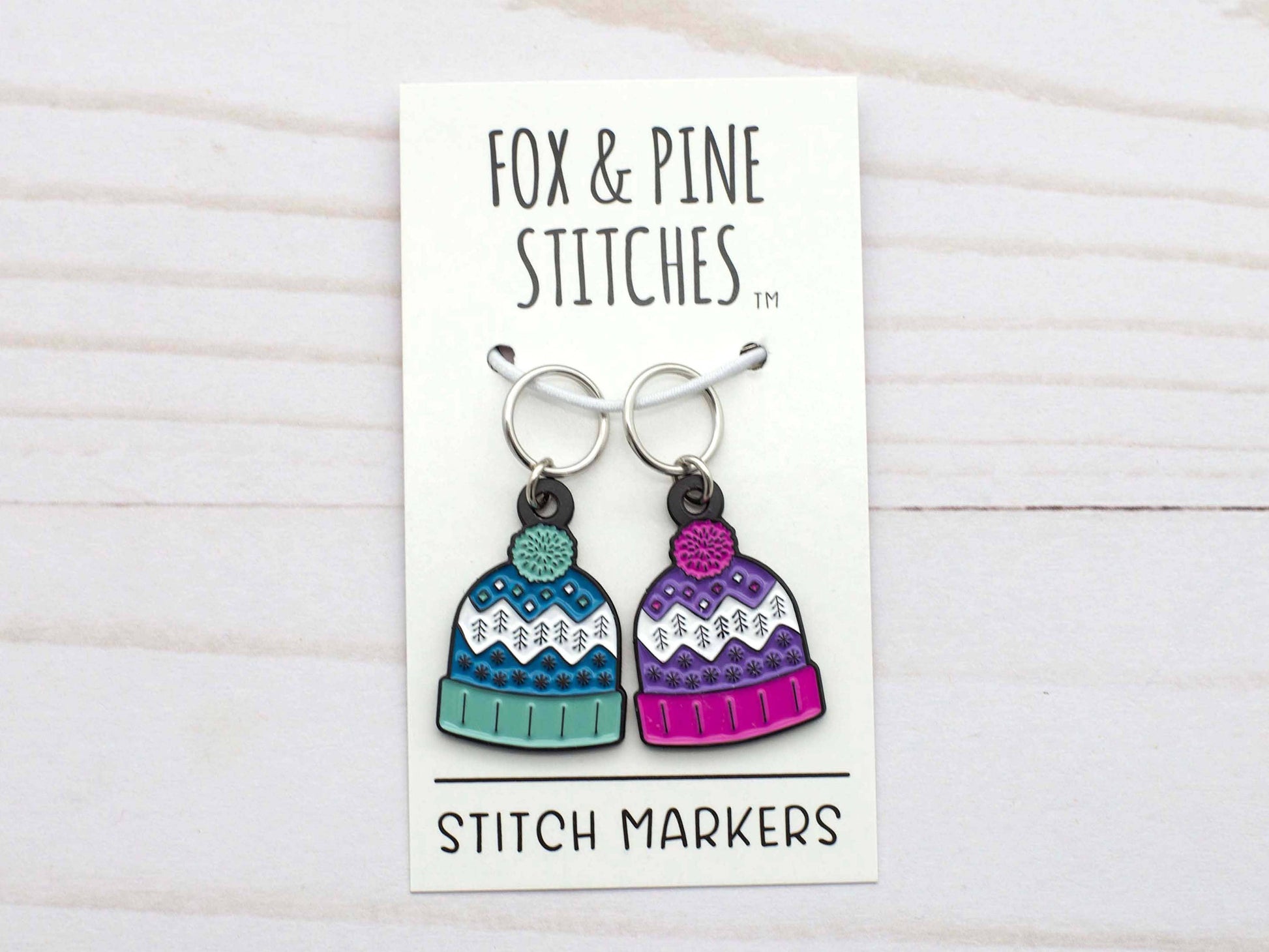 Introducing Fox & Pine Stitches Warm and Cozy stitch markers. The collection includes hat, socks, mittens and sweater designs. This listing is for a set of two stitch markers as shown with a snag-free closed ring. The rings fit up to a size US 11 / 8 mm knitting needle.